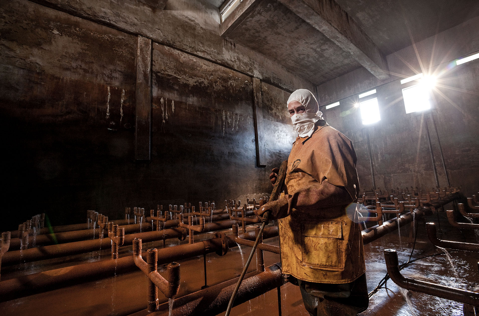 DVGW Hamburg Wasser, Schwerstarbeit: Im Wasserwerk wird eine Verdüsungskammer von Eisen- und Manganrückständen gereinigt